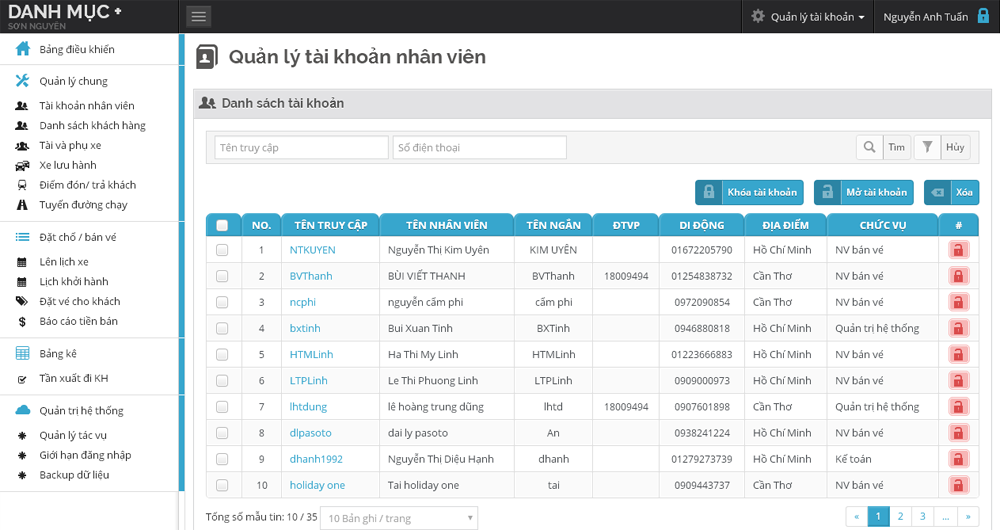 Thống kê nhân viên: - Quản lý nhân viên bán được bao nhiêu vé bao gồm các thông tin: ngày bán vé, giời bán vé, ngày khởi hành, giời khởi hành, loại khách hàng, số điện thoại, điểm đón và điểm đến. - Hỗ trợ khách hàng tìm kiếm theo tên nhân viên, theo ngày và xuất file excel.